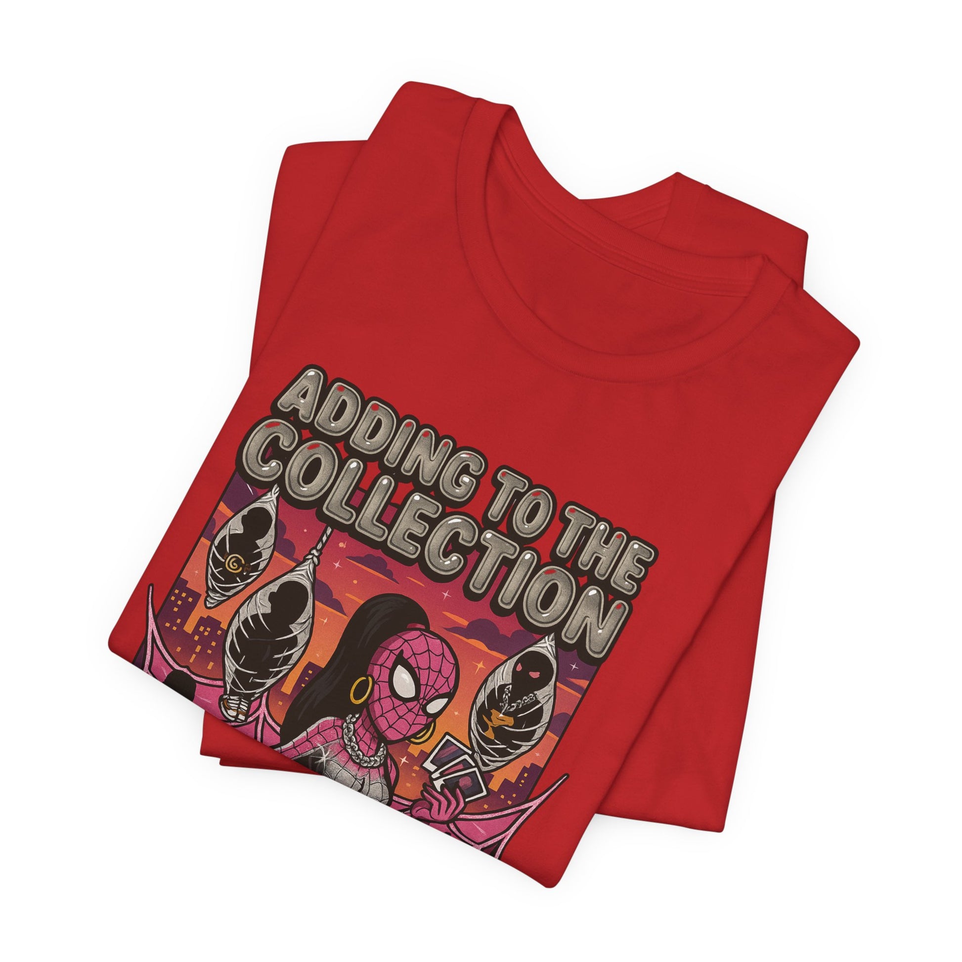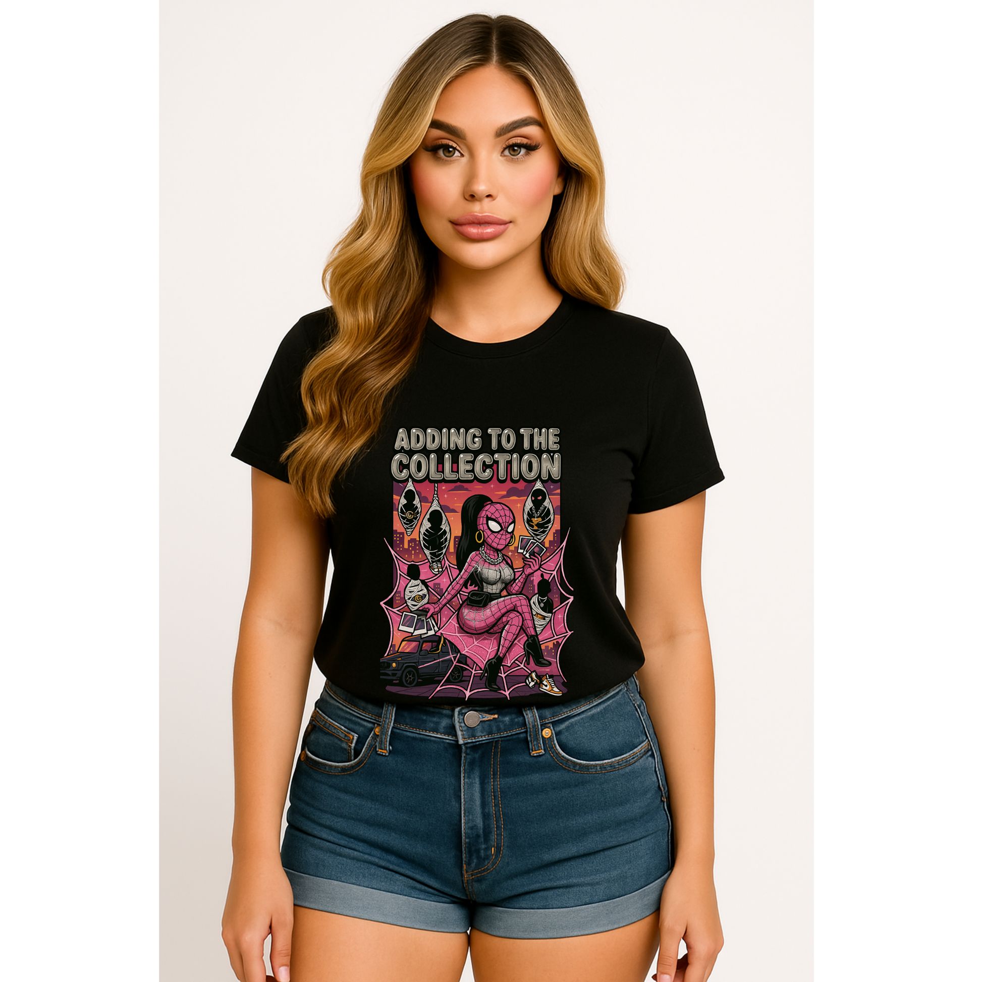 Drip, danger, and a little bit of petty power — our “Adding to the Collection” graphic tee is made for the ones who know how to secure what’s theirs. This design features a fierce masked baddie lounging in her pink web, flaunting her latest ‘acquisitions’ with a skyline backdrop. Perfect for streetwear lovers who want to turn heads and spark conversation, this tee is a bold flex in both style and attitude. Available in classic black or crisp white to fit your vibe.