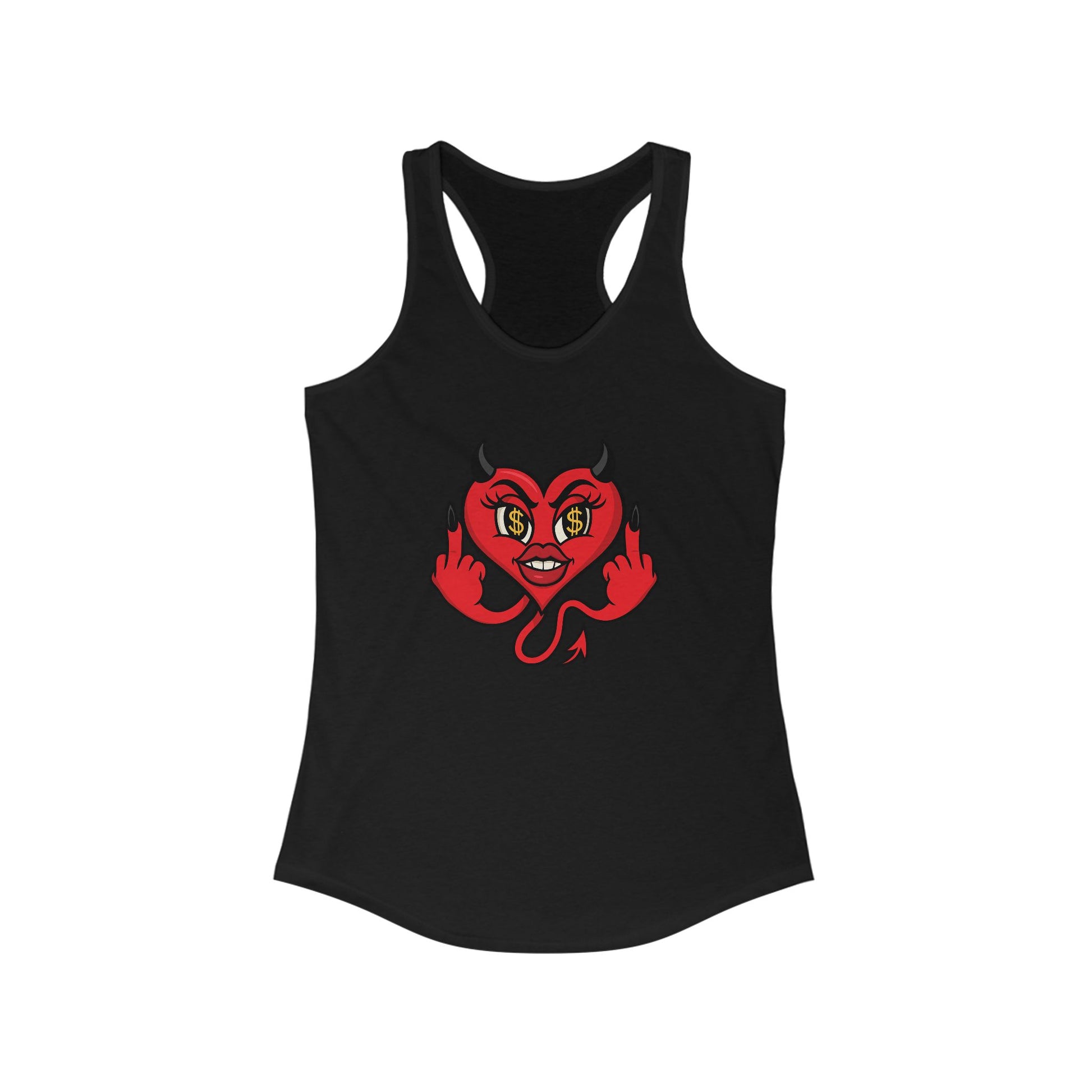 This devil-heart crop tank says what your face wants to—flipping off bad energy with dollar signs in her eyes. Mood? Unbothered & unavailable. Period.