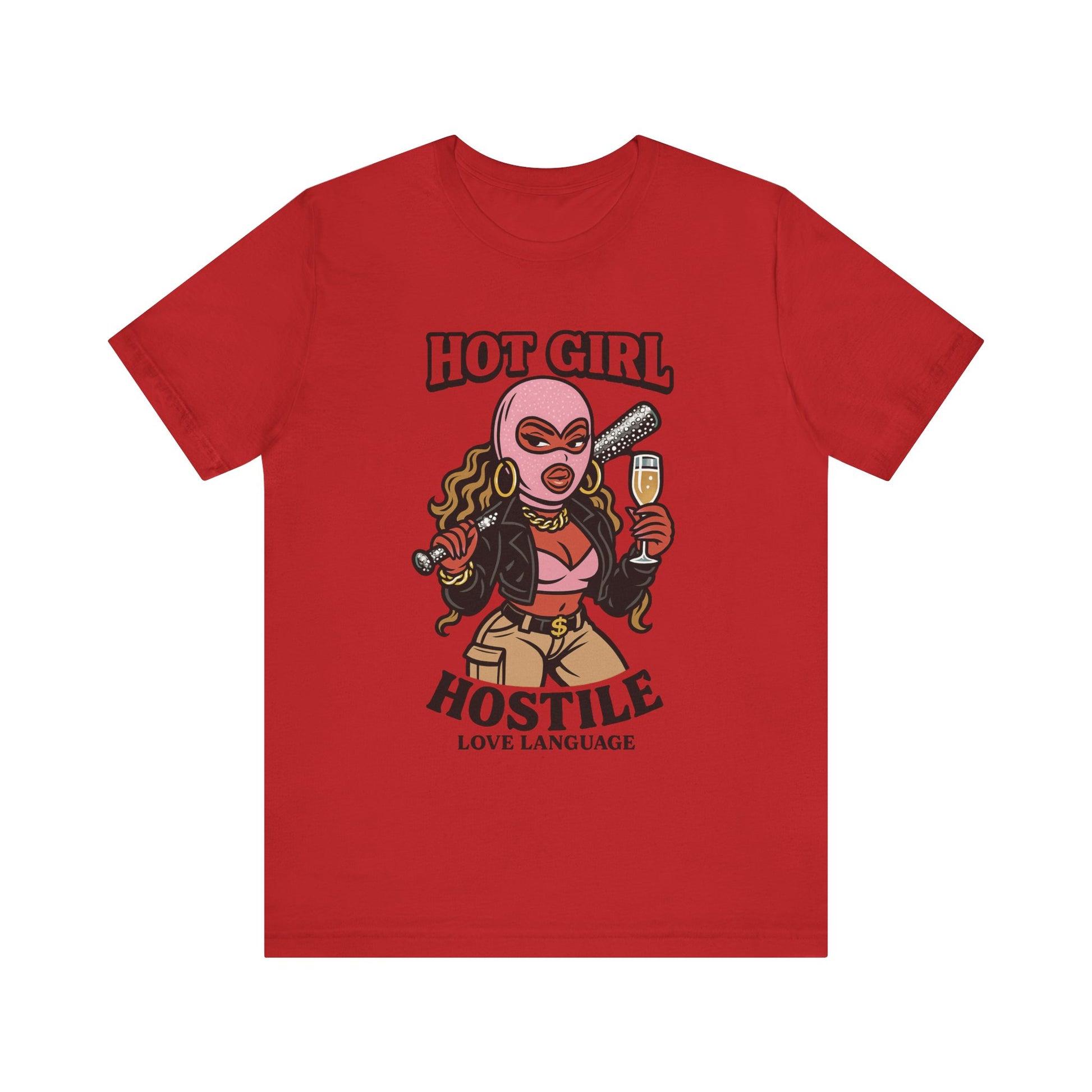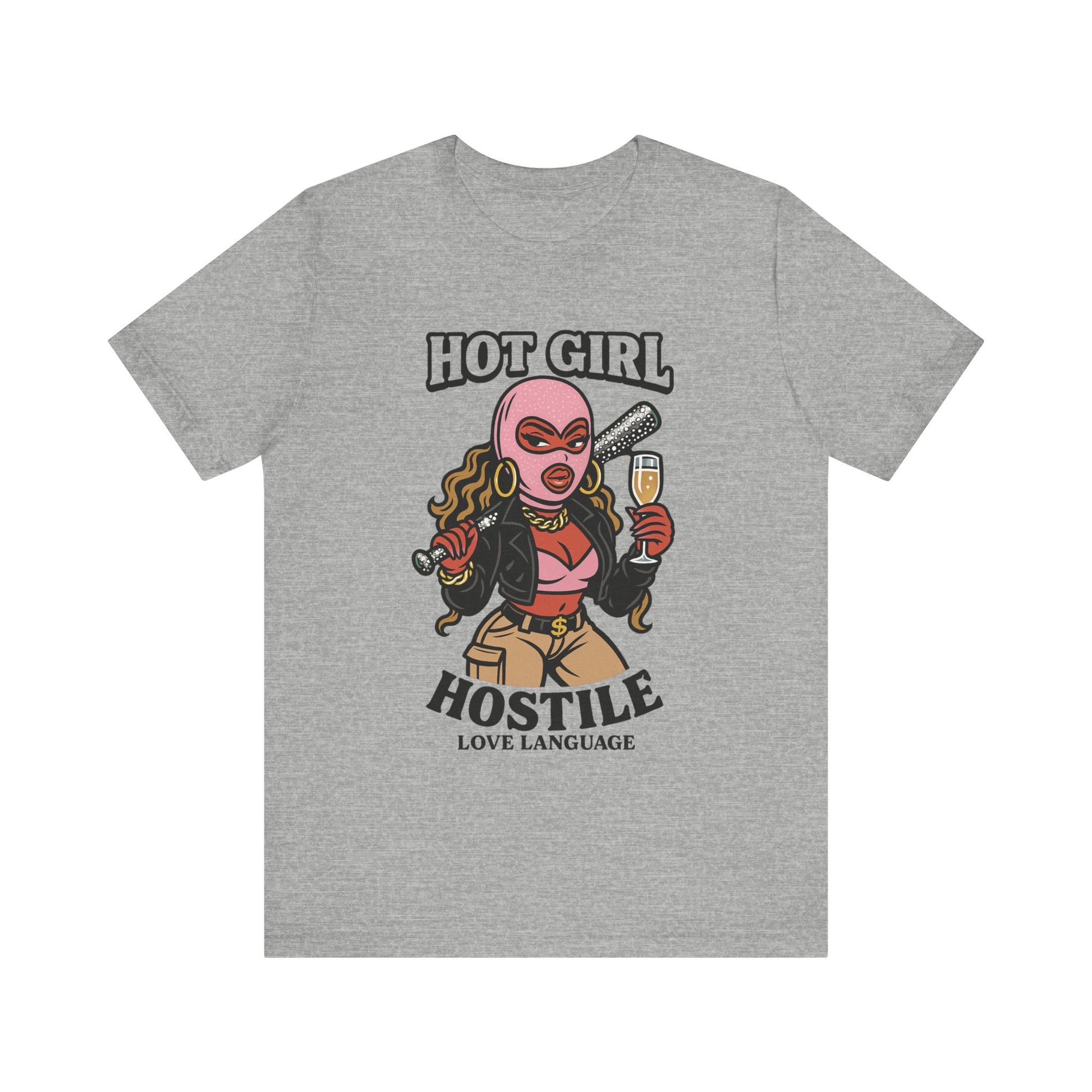 Turn up the heat and the attitude in our Hot Girl Hostile Love Language tee. Featuring a bold cartoon baddie in a pink ski mask, holding a champagne glass in one hand and a bedazzled bat in the other, this shirt is pure unapologetic energy. Soft cotton, relaxed fit — perfect for pairing with jeans, cargos, or your ‘don’t mess with me’ mood.