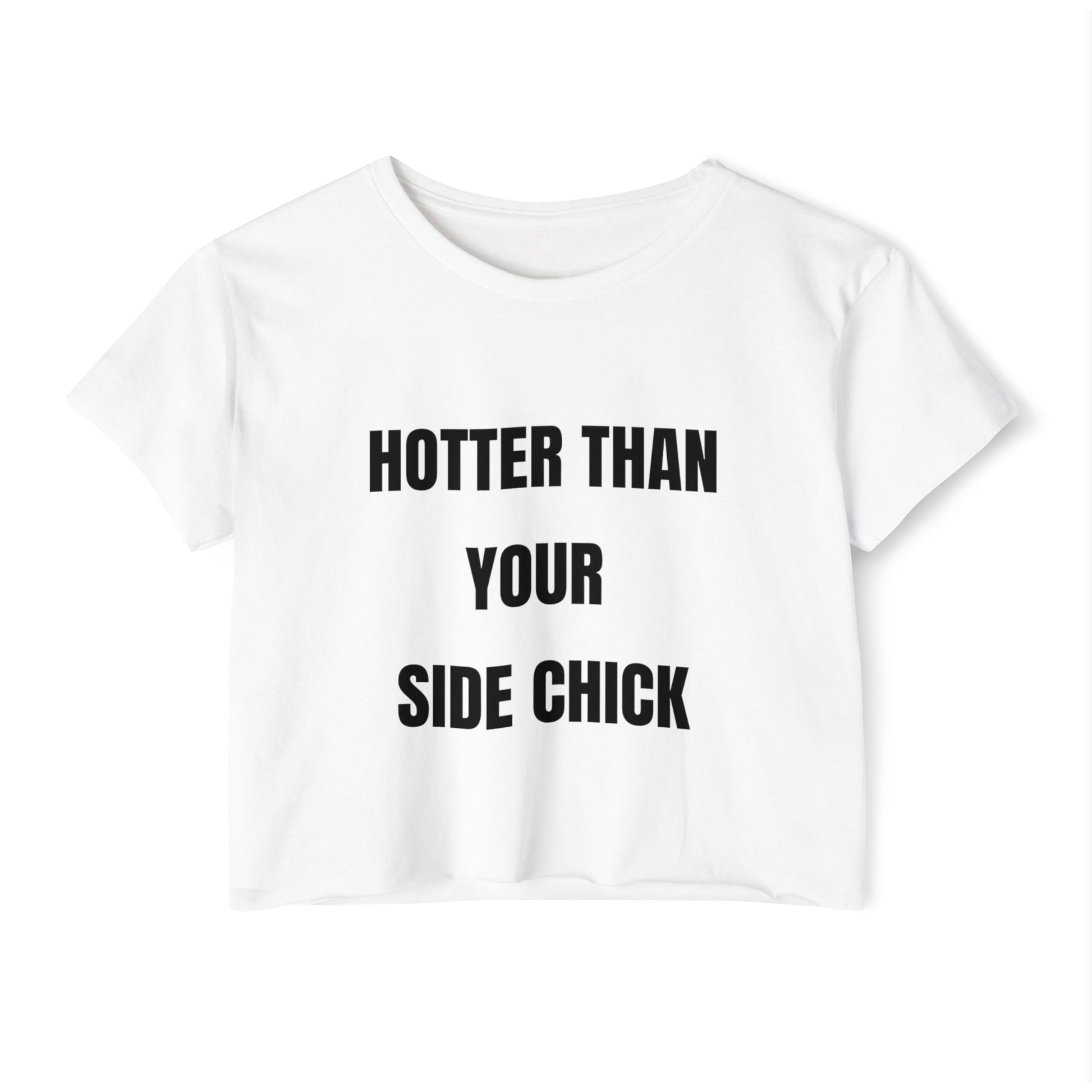 Turn heads and break hearts in the Hotter Than Your Side Chick crop top. This bold statement tee is made for unapologetic baddies who know their worth and don’t shy away from saying it. Crafted from soft, breathable cotton with just the right amount of stretch, it’s perfect for brunch shade, club nights, or casually letting them know you’re that girl.